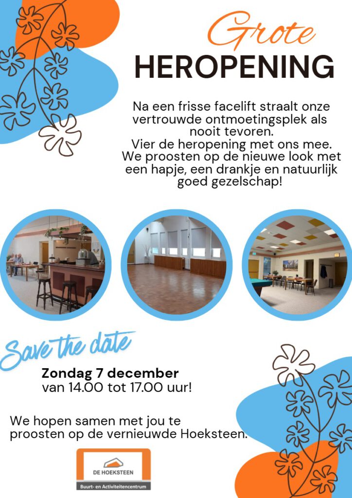 De feestelijke her-opening van de Hoeksteen vindt plaats op Zondag 7 december van 14.00-17.00. Iedereen is van harte welkom!