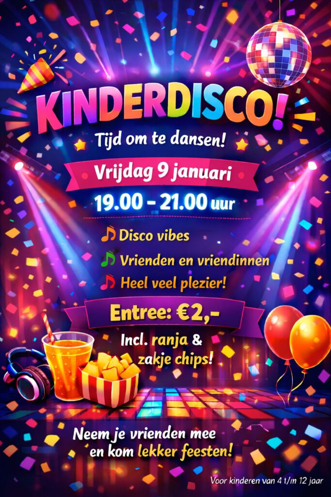 Elke eerste vrijdag van de maand is het feest tijdens onze Kinderdisco! Een gezellige en veilige discoavond voor kinderen van 4 t/m 12 jaar, vol muziek, lichtjes en dansplezier. Samen met vriendjes en vriendinnetjes kunnen de kinderen lekker losgaan op vrolijke hits en echte disco vibes