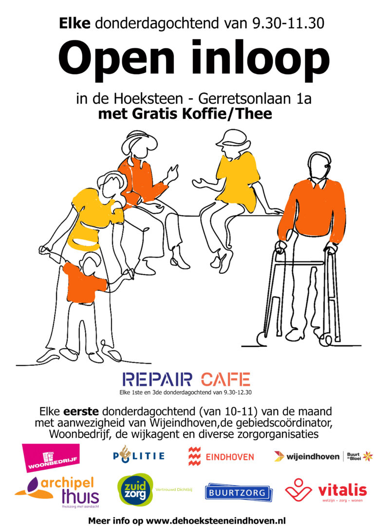 Daarnaast zijn elke eerste donderdagochtend van de maand (van 10.00 tot 11.00 uur) verschillende organisaties aanwezig, zoals WIJ Eindhoven, de gebiedscoördinator, Woonbedrijf, de wijkagent en diverse zorg- en welzijnsorganisaties. Zij denken graag met u mee en beantwoorden vragen over wonen, zorg, welzijn en veiligheid in de wijk.